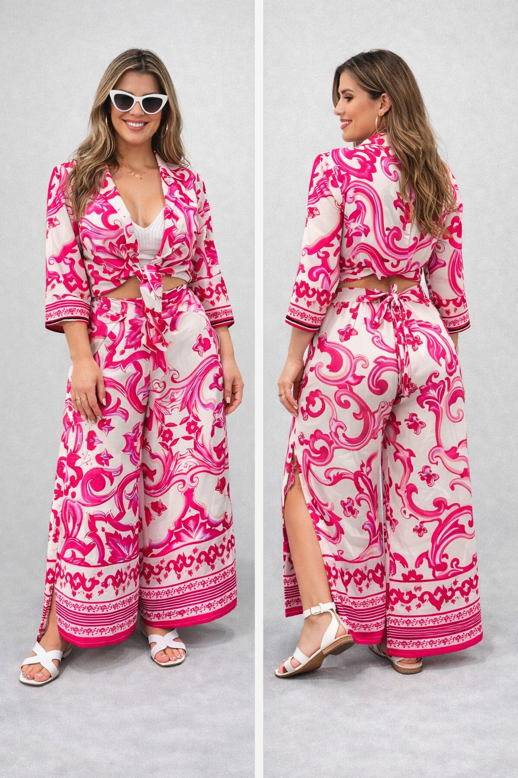 onjunto em seda leve e sofisticada, composto por chemise e calça envelope, que traduz feminilidade e requinte em cada detalhe. A estampa exclusiva em tons de rosa e off-white remete ao estilo clássico italiano, com inspiração na estética exuberante da Dolce & Gabbana, combinando arabescos e elementos ornamentais com equilíbrio e sofisticação.