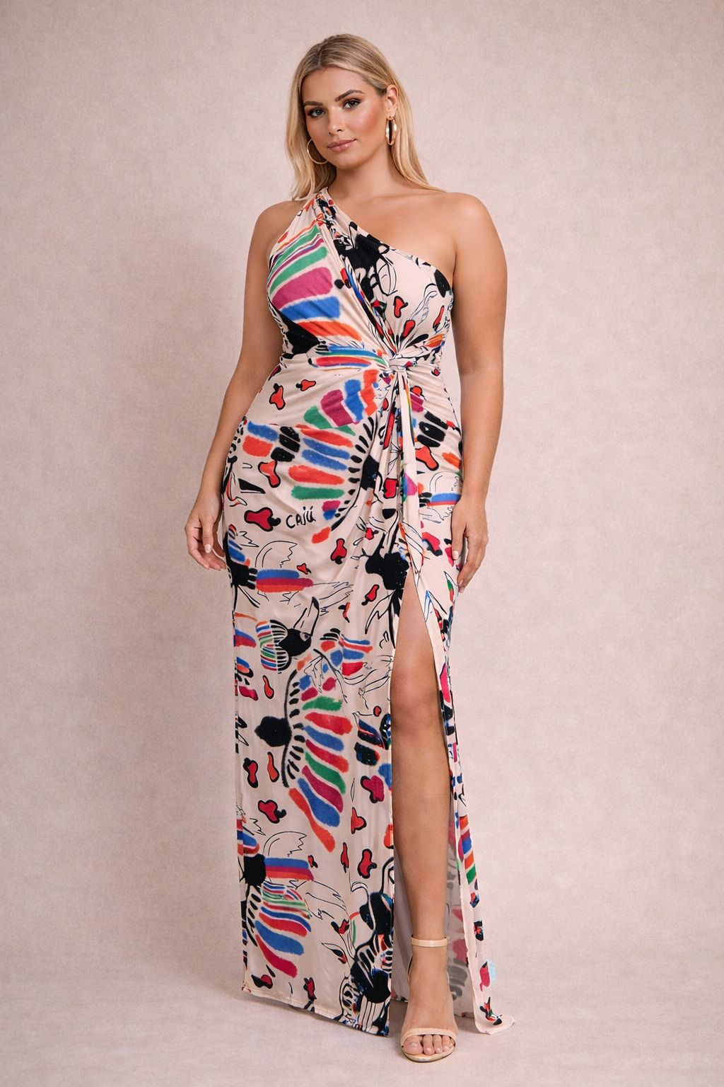 O vestido com nó modelador em tecido fluity é uma escolha elegante e sofisticada para eventos formais e informais.