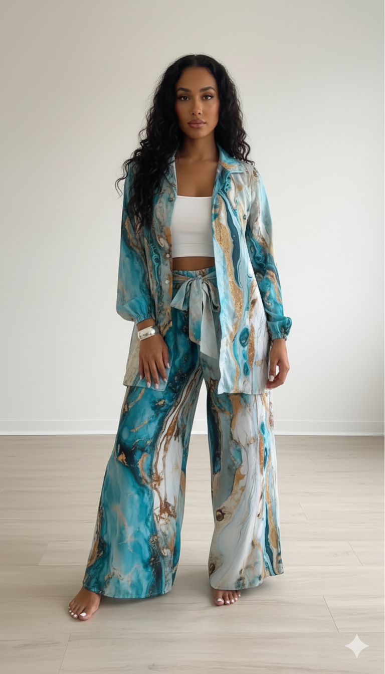 A chemise de modelagem fluida oferece versatilidade e charme, podendo ser usada aberta ou fechada, enquanto a calça envelope de caimento amplo proporciona conforto absoluto e movimento elegante, valorizando a silhueta com leveza. Ideal para produções resort, ocasiões especiais ou composições fashionistas que pedem presença e personalidade.