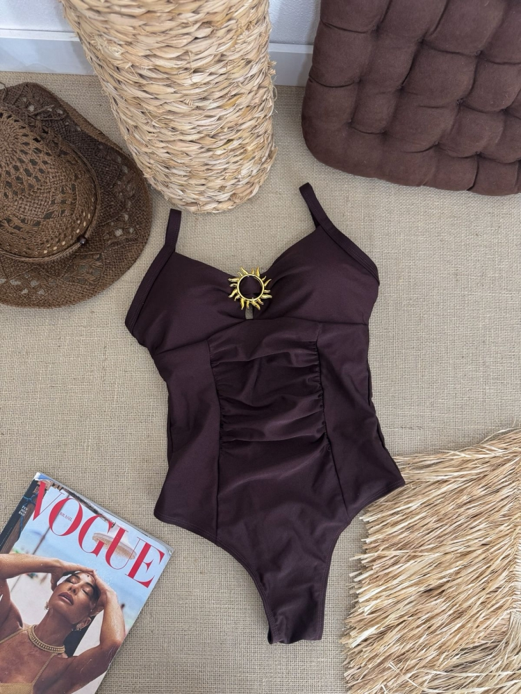 Detalhe Ornamental: O ponto focal da peça é um adorno metálico dourado em formato de sol posicionado no centro do busto, unindo as copas.