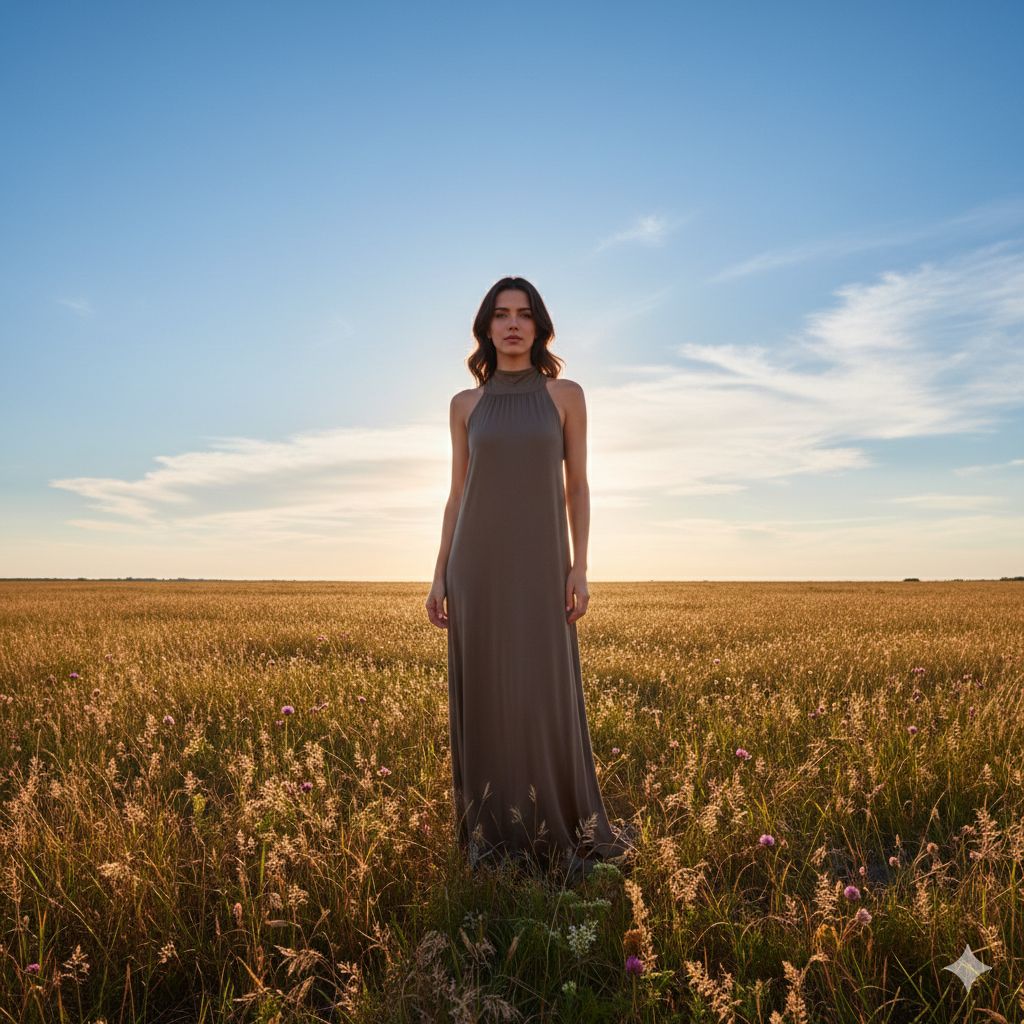 O vestido Cilla, confeccionado em tecido Fluity, caracteriza-se pelo seu caimento leve e suave, que confere fluidez e movimento à peça. O tecido Fluity é conhecido por sua elasticidade, toque macio e frescor, ideal para criar peças elegantes e confortáveis.