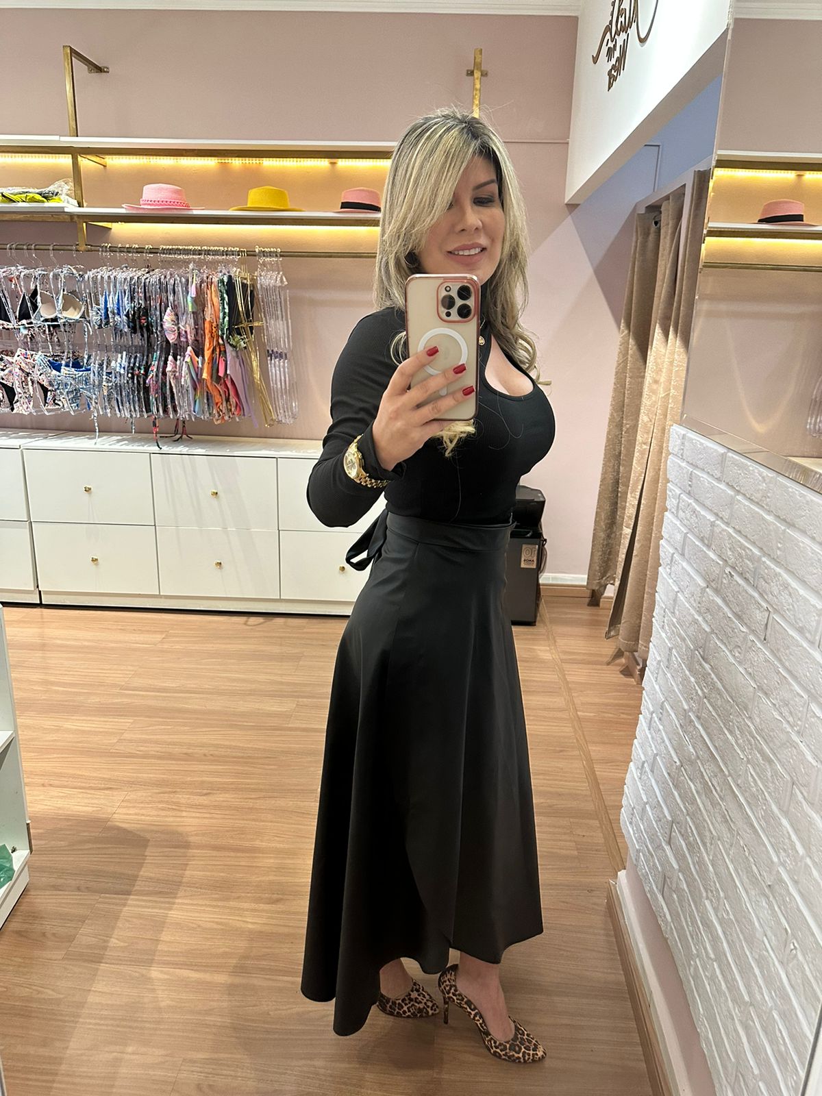 A saia de couro eco é uma peça elegante e versátil, com ela dá para contar várias propostas de looks.