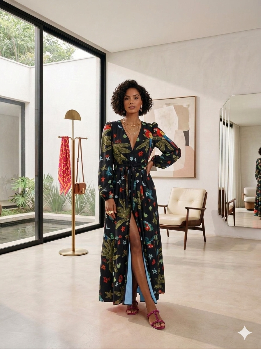 Com uma estampa exclusiva de araras e folhagens sobre o fundo preto, ela une o frescor da modelagem longline com a sofisticação das mangas bufantes e o decote em V que valoriza a silhueta. Perfeita para transitar do pós-praia a um jantar especial à beira-mar. 🥂✨