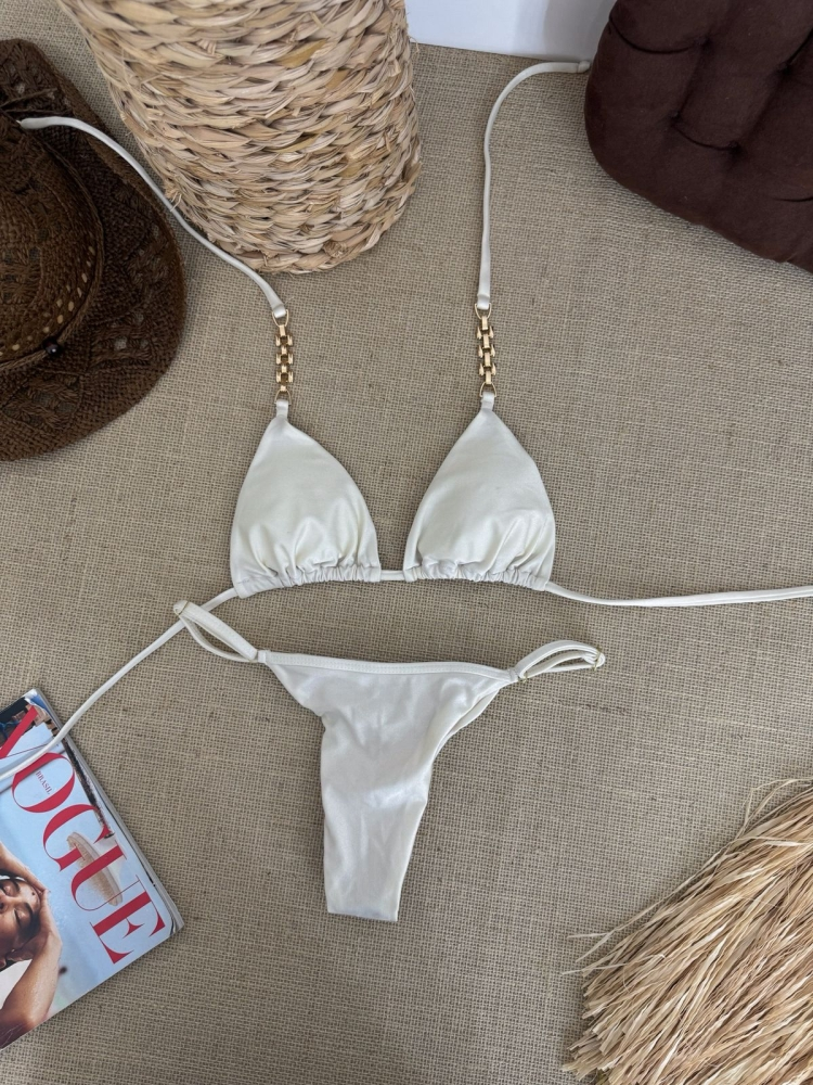 Conjunto de biquíni confeccionado em tecido de alta qualidade, com toque macio e excelente elasticidade. O top possui modelagem cortininha com leve franzido, alças finas com detalhe em corrente metálica dourada e amarração regulável, proporcionando ajuste personalizado e sustentação confortável.